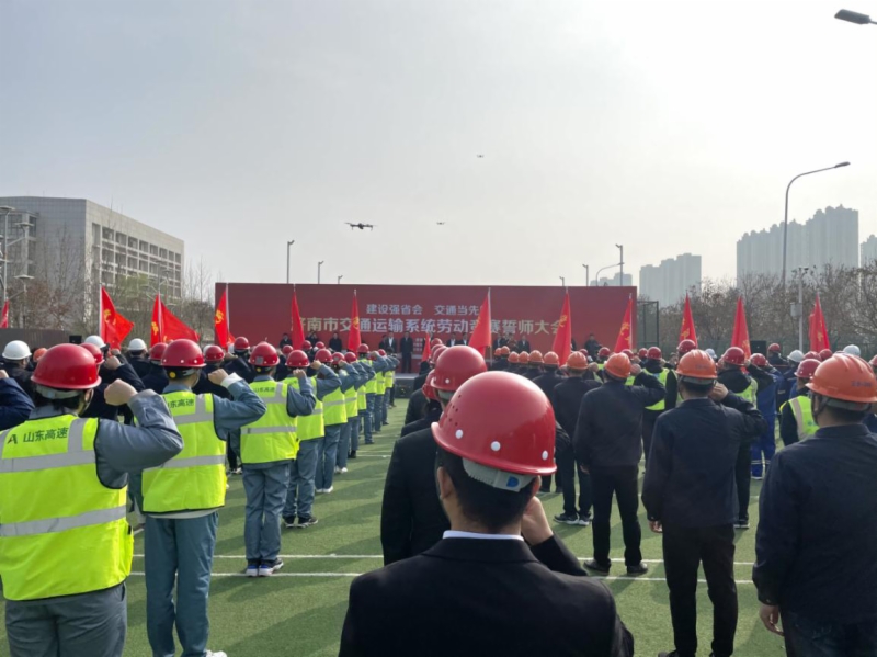 3月14日上午,济南市交通运输系统“建设强省会 交通当先锋”劳动竞赛誓师大会在腊山河西路北延工程现场举行。副市长王京文出席大会并宣布竞赛启动,市城乡交通运输局党组书记、局长贾玉良主持大会。集团工会主席张庆星率领集团党员突击队参加大会。大会向76net必赢官网党员突击队、山东高速集团党员突击队、机场工程建设党员突击队、轨道交通集团党员突击队等12支队伍授旗。