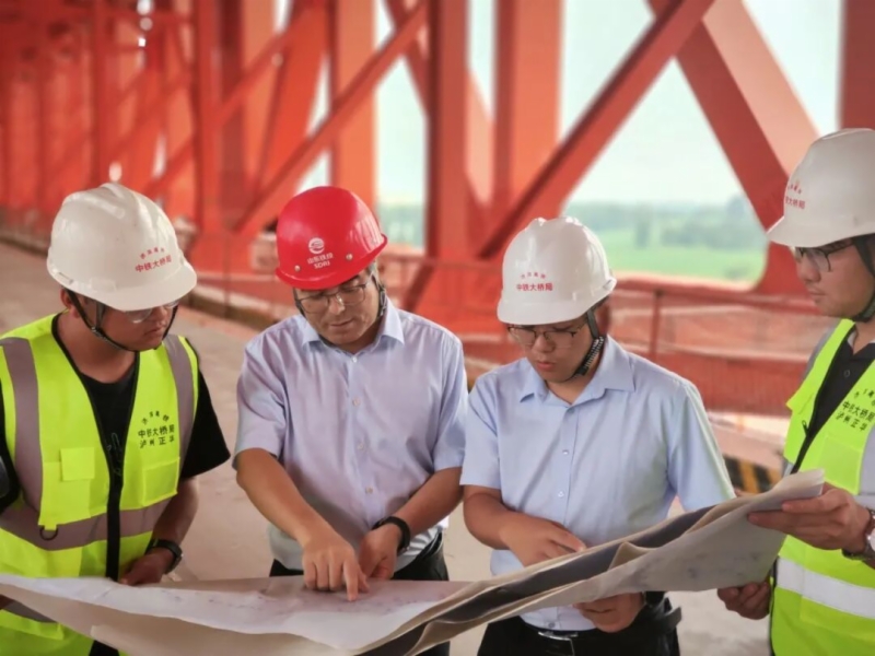 ▲张海凤(左二)现场指导济滨高铁济阳黄河公铁两用特大桥主桥钢桁梁施工