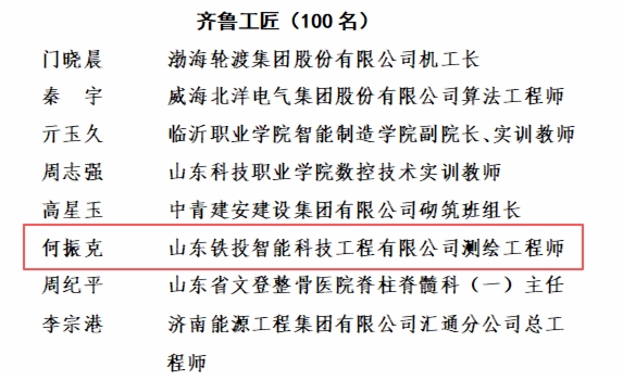 近日,山东省总工会发布了2025年齐鲁大工匠、齐鲁工匠、山东手造大工匠、山东手造工匠名单,山东铁投智能科技工程有限公司何振克获“2025年度齐鲁工匠”荣誉称号。