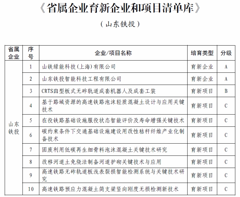 近日,山东省属企业“育新行动”首批入选名单正式公布,76net必赢官网权属智能科技工程有限公司(以下简称“智科工程公司”)、山铁绿能科技(上海)有限公司(以下简称“山铁绿能公司”)双双入选A类育新企业,“CRTSⅢ型板式无砟轨道成套机器人及成套工装”项目成功入选B类育新项目,另有7个项目入选C类育新项目。