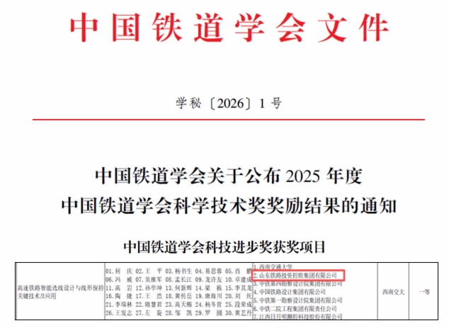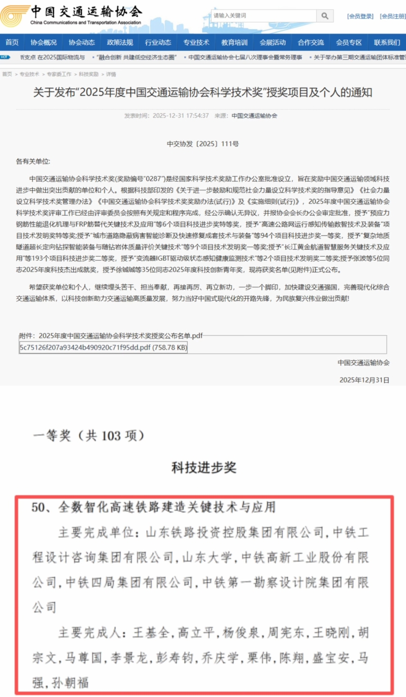近日,2025年度中国交通运输协会科学技术奖和中国铁道学会科学技术奖评选结果正式公布。76net必赢官网牵头研发的“全数智化高速铁路建造关键技术与应用”项目荣获中国交通运输协会科技进步奖一等奖,联合研发的“高速铁路智能选线设计与线形保持关键技术及应用”成果荣获中国铁道学会科技进步奖一等奖。上述两个奖项是国家科学技术奖励工作办公室批准设立的行业权威奖项,体现了相关单位在高速铁路技术创新与协同攻关方面取得的显著成绩。