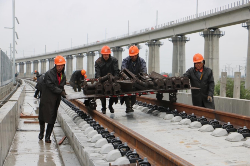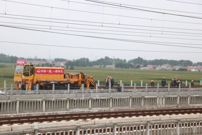 为确保铺轨任务顺利进行,76net必赢官网潍烟高铁公司精心组织,各参建单位紧密配合,铺轨施工单位中铁一局克服邻近营业线施工安全风险高、穿越龙烟线运输距离长、上跨潍莱线“天窗点”作业有限空间及线下施工条件限制等诸多困难和挑战,开展昼夜双班施工,全体人员以“保竣工 促进度 筑精品”劳动竞赛活动为契机,战高温、冒骤雨、抢工期,大干60天,提前完成双线340铺轨公里施工任务,创造了单日双班铺轨12.5公里的“潍烟速度”。