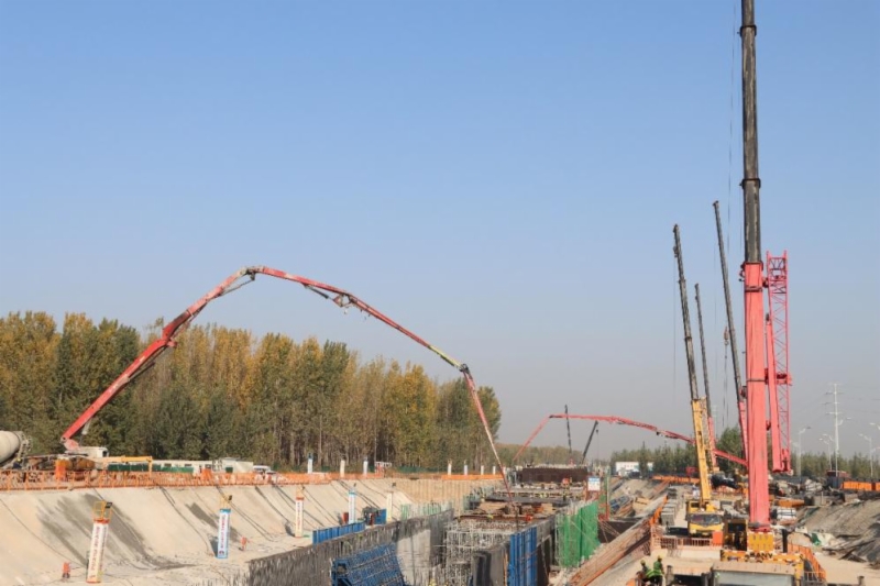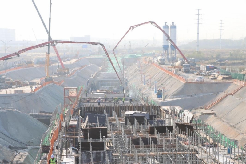 本次浇筑的首块主体结构顶板位于遥墙机场2#隧道出口段,采用隧道主体混凝土浇筑台车一次浇筑墙身和顶板的施工工艺。其中,首板顶板全长10.5米、结构宽度13.3米、厚度0.8m、高8.5米,一次性浇筑面积约140平方米,采用C45p12型混凝土并结合混凝土分层浇筑法一次成型浇筑,浇筑混凝土方量约125.16立方米。