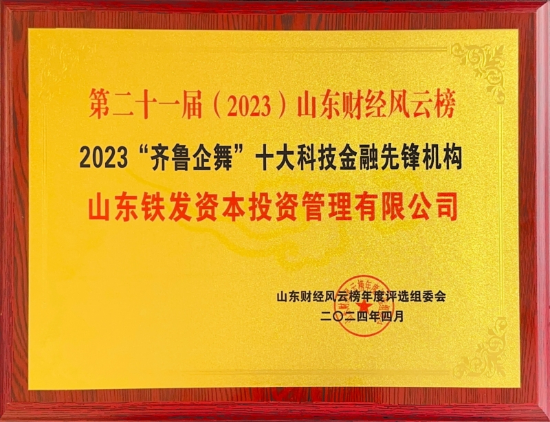 4月28日,由大众报业集团(大众日报社)主办,山东财经大学、山东省宏观经济研究院、山东省互联网传媒集团、《经济导报》社联合承办的“第二十一届(2023)山东财经风云榜”发布,山东铁发资本投资管理有限公司荣膺“2023‘齐鲁企舞’十大科技金融先锋机构”。