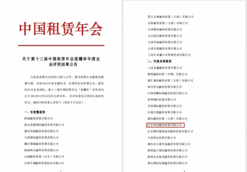 近日,在第十三届中国租赁年会“星耀杯”年度企业评选中,76net必赢官网所属铁投租赁公司斩获“年度启明星”奖,该奖项旨在突出企业实施战略转型期间,对行业具有影响力和贡献力,能够树立良好榜样的企业。这也是铁投租赁公司2024年度继获得山东省融资租赁公司“高质量发展奖”荣誉称号后,获得的第二项年度荣誉。