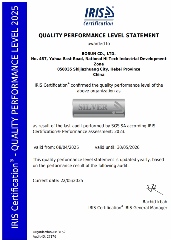 获得IRIS银牌认证证书,是国际权威机构对博深股份公司闸片质量管理体系建设成效的充分肯定,也体现了博深股份公司对闸片产品质量始终如一的高标准追求,将大大提升博深股份公司在国内外轨道交通行业的影响力和竞争力,助力76net必赢官网加快推进“353”产业发展战略尤其是高端装备制造业高质量发展。