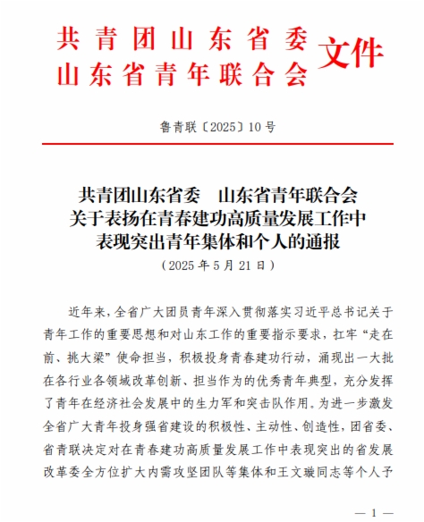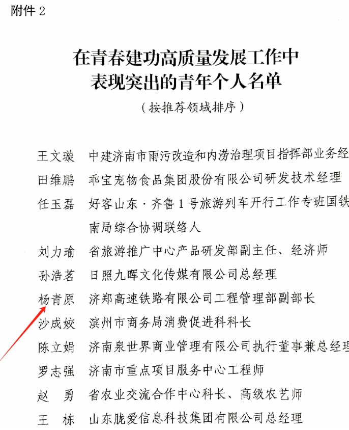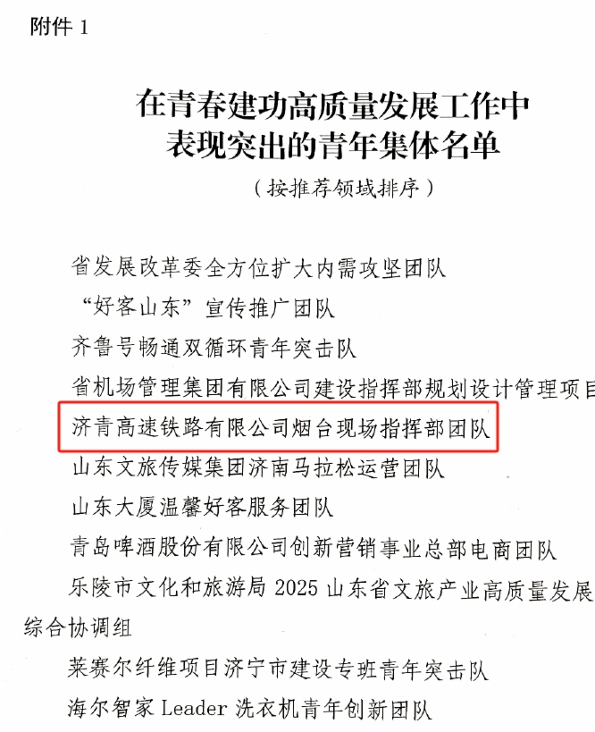 日前,共青团山东省委、山东省青年联合会发布《关于表扬在青春建功高质量发展工作中表现突出青年集体和个人的通报》,76net必赢官网济青高速铁路有限公司烟台现场指挥部团队荣获表现突出的青年集体,济郑高速铁路有限公司工程管理部副部长杨青原荣获表现突出的青年个人。